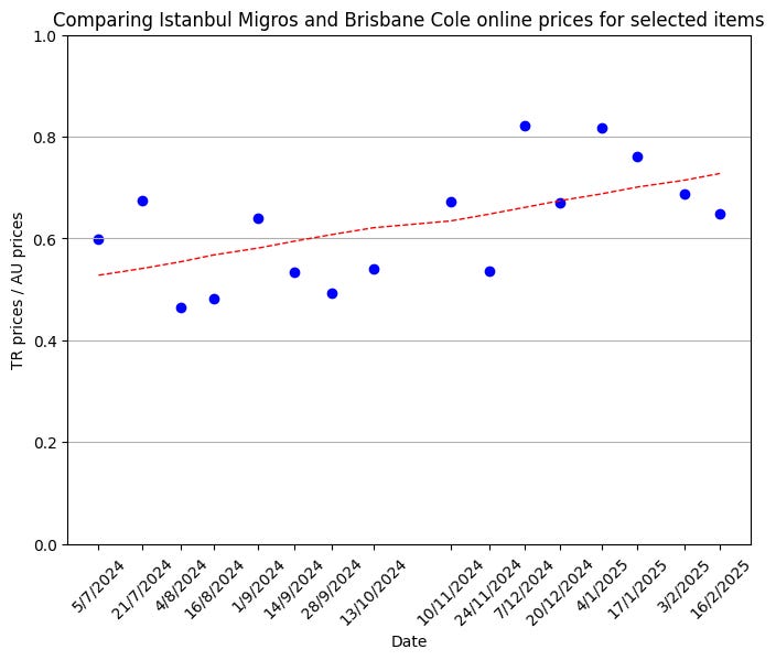 The trend (the red dotted line) is rising, which means that, since 5 July 2024, the Turkish prices are slowly approaching the Australian prices. Some items, e.g. beef mince, is more expensive than in Brisbane and has been consistently so since I started this chart.
