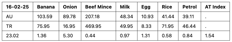 Based on my basket of goods, Australia is 54% more expensive this week compared to Istanbul. Both Coles (AU) and Migros (TR) prices are expressed in Turkish liras for the items in the basket on 16 February 2025. I converted Coles prices to Turkish liras at the exchange rate of 1AUD=23.02 TRY.