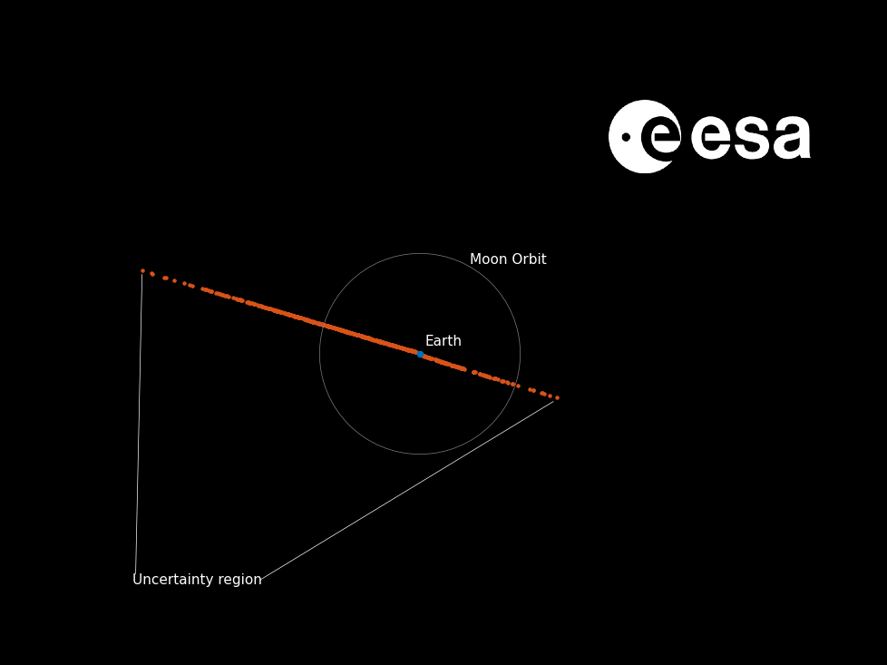 In December 2024, the Minor Planet Center (MPC) of the International Astronomical Union (IAU) reported the discovery of an asteroid designated as 2024 YR4. The asteroid is expected to pass close to Earth on 22 December 2032. Since we do not have the exact trajectory data, we cannot tell how close an encounter that will be. The following image taken from the European Space Agency web site shows the risk corridor. The red line is a Monte Carlo simulation comprising 500 points showing where the asteroid might pass. The risk is higher where the red dots are denser. The probability of a direct Earth hit is 1 in 40 based on this simulation.