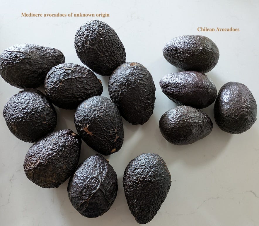 The avocado season in Brisbane is the first half of the year. The rest of the year we get our avocadoes from Western Australia. This year Western Australian crop failed and for six months the offering in the markets was very poor. Some avocadoes were imported from Chile but they were small and the flesh looked and tasted like plastic: