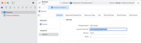 open ios/Runner.xcworkspaceThis start Xcode app. Clicking on the Runner tab, I find the iOS identity: