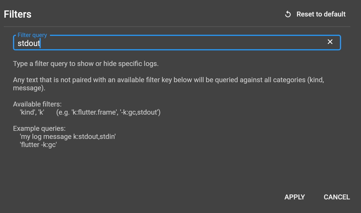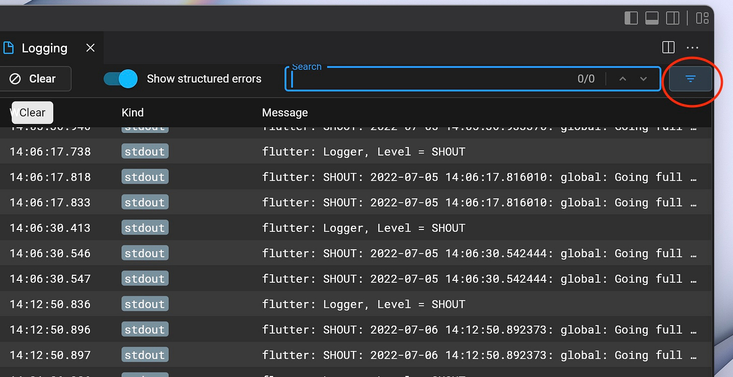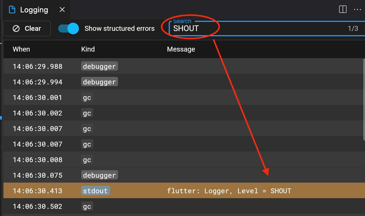 VS Code içinde, Dart : OpenDev Tools içinde Open Logging Page opsiyonu seçilirse (see https://docs.flutter.dev/development/tools/devtools/logging for info on this panel), VS Code yeni bir pano açıyor ve program işlerken logging mesajları orda oluyor.