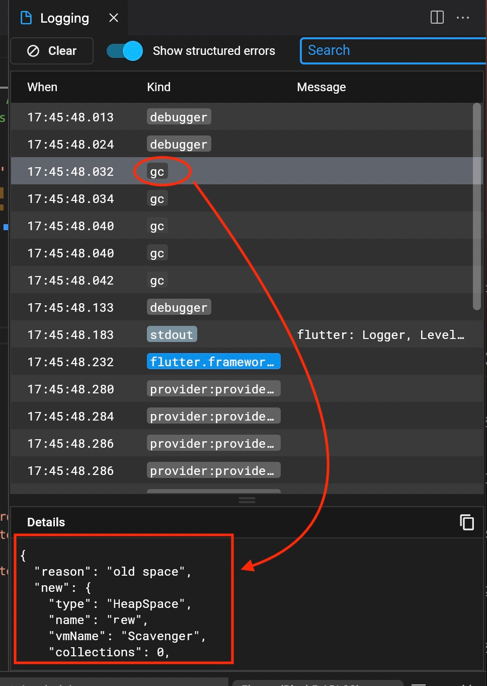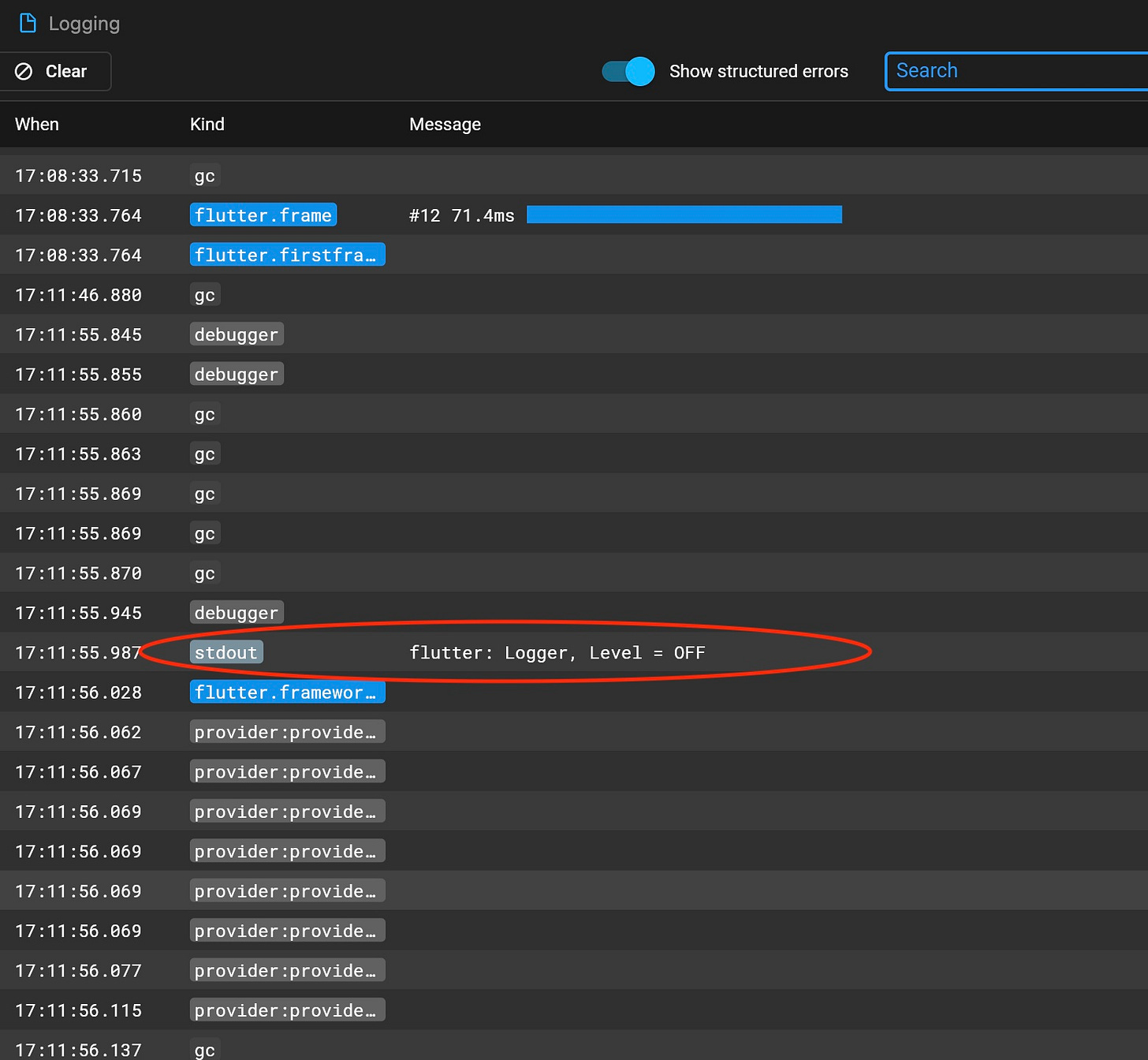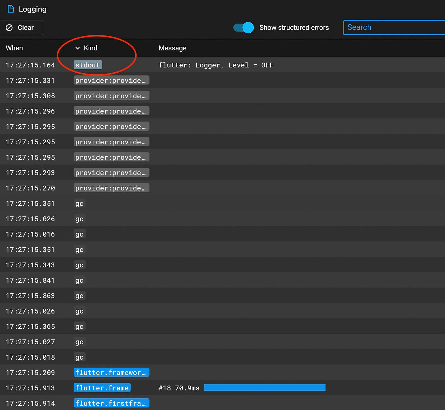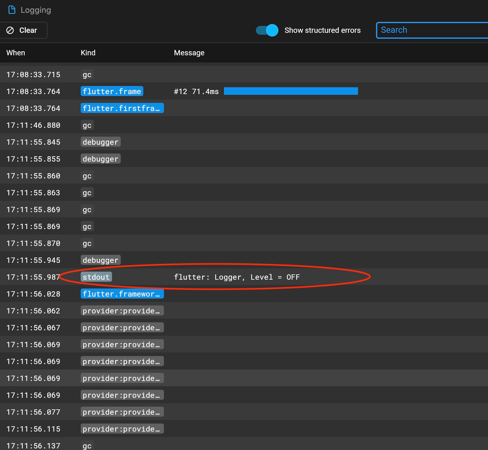 The debugPrint outputs to stdout. In the logging panel, flutter execution outputs other channels as well, e.g. gc, provider:provide…, etc. By clicking on them, one can see the details. For example, I clicked on gc:
