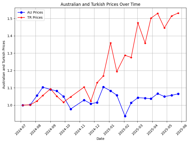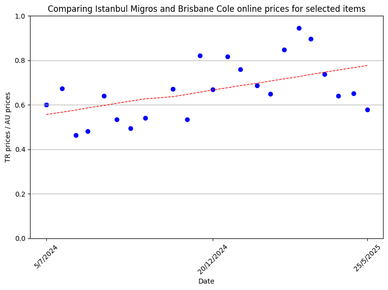 Although the trend (the red dotted line) is rising, which means that, since 5 July 2024, the Turkish prices have been slowly approaching the Australian prices, it started flattening in recent months. Some items, e.g. beef mince and rice, are more expensive than in Brisbane and has been consistently so since I started this chart.