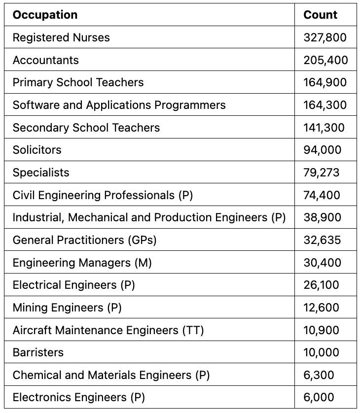 This category includes a wide range of occupations. I constructed a detailed table using figures from multiple sources, not all from the same year. The breakdowns for engineers and lawyers are from Australian Jobs 2023, while the figures for doctors are from the Australian Medical Board (via ChatGPT). The remainder is based on the 2021 Census.