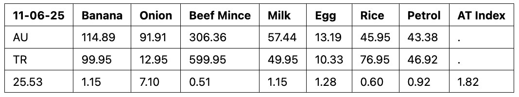Based on my basket of goods, Australia is 82% more expensive this week compared to Istanbul. Both Coles (AU) and Migros (TR) prices are expressed in Turkish liras for the items in the basket on 11 May 2025. I converted Coles prices to Turkish liras at the exchange rate of 1AUD=25.53 TRY.
