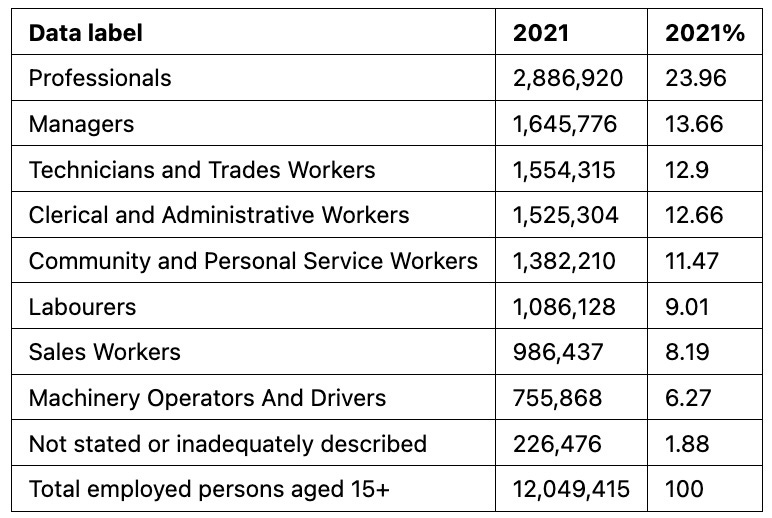 It’s useful to start by looking at the current employment landscape. The table below shows the distribution of Australian workers across various occupations in 2021, based on responses to the national census. The data is sourced from profile.id.com.au.