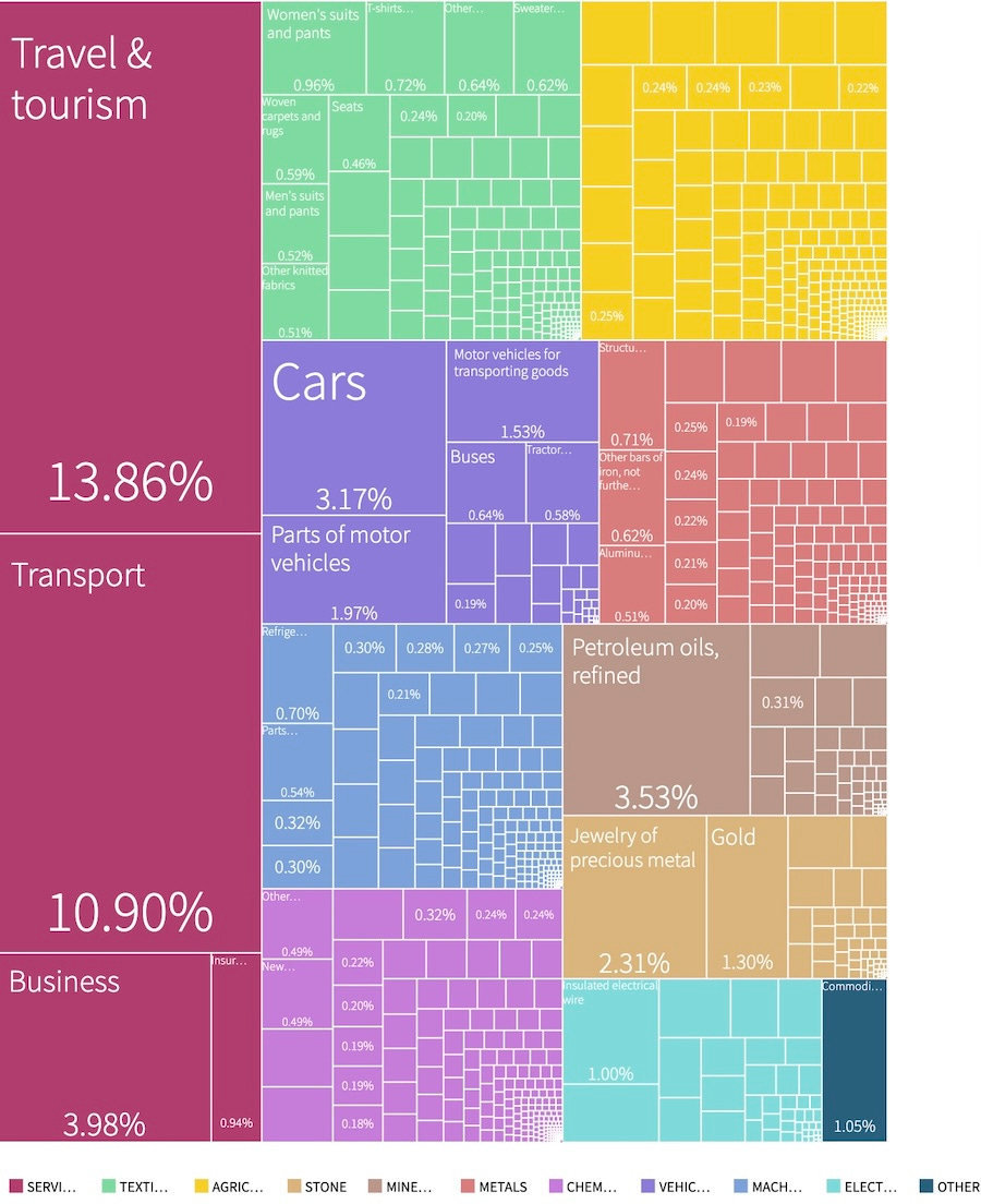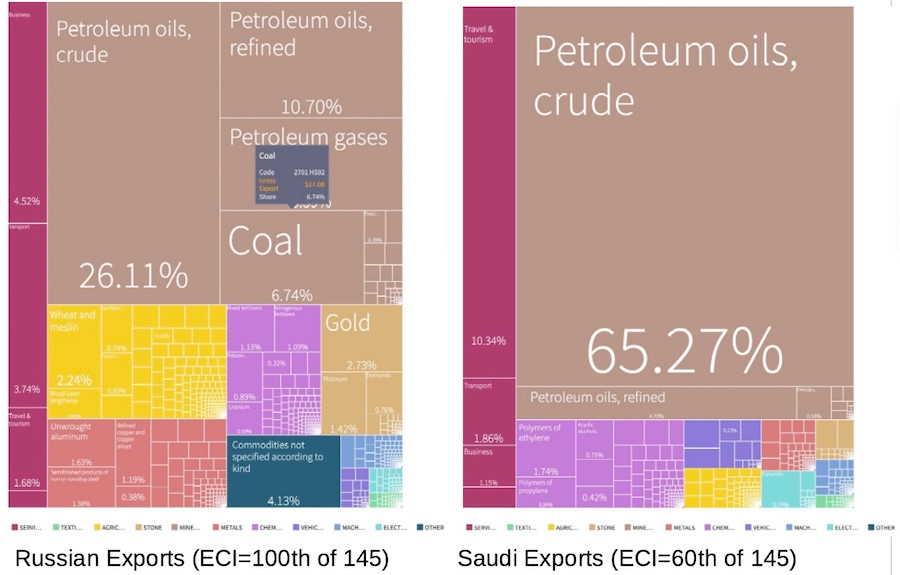 Both countries rely on fuel exports and Russia ranks 100th in the Atlas of 145 countries, and Saudi Arabia ranks 60th. In contrast, Turkey has a much more complex export composition and has the rank of 42 in 145 countries. The following is the composition of the Turkish exports. The contrast with the Russian and Saudi charts is obvious.