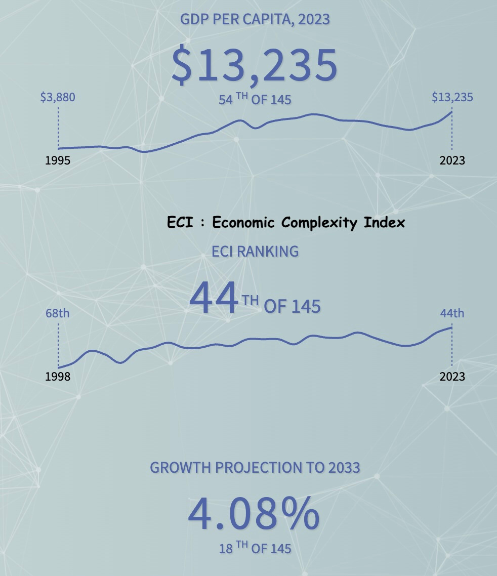 The Atlas concludes that Turkey’s economic complexity slightly surpasses expectations given its current income level, predicting moderate but steady growth. Specifically, Turkey is expected to achieve annual economic growth of approximately 4.1% over the next decade, placing it in the top quartile globally.
