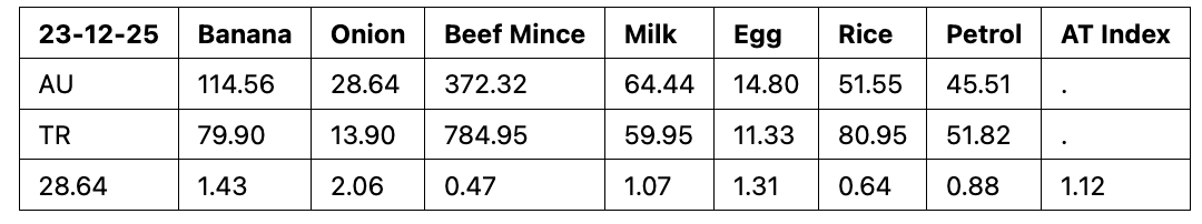 Based on my basket of goods, I compare Turkish and Australian prices. Both Coles (AU) and Migros (TR) prices are expressed in Turkish liras in the following tables. I converted Coles prices to Turkish liras at the exchange rate of 1AUD=28.64TRY.