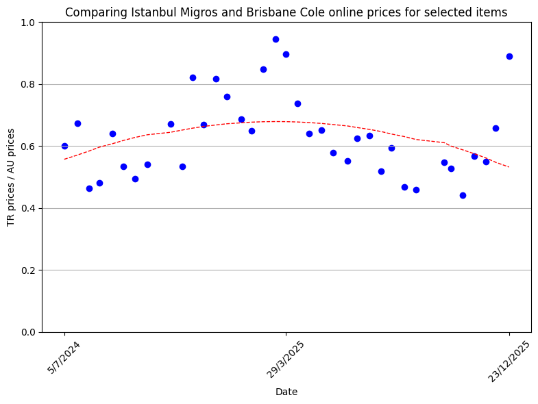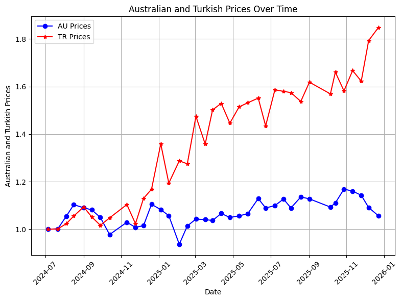 I started this section on 5 July 2024. The Turkish prices initially rose fast. Since February 2025, the Turkish prices had been getting increasingly lower compared to the Australian prices. The trend seems to have been reversing for the last several weeks with the Turkish prices rising again compared to the Australian prices.